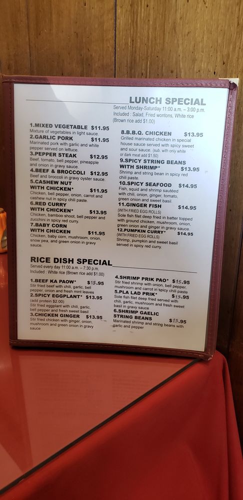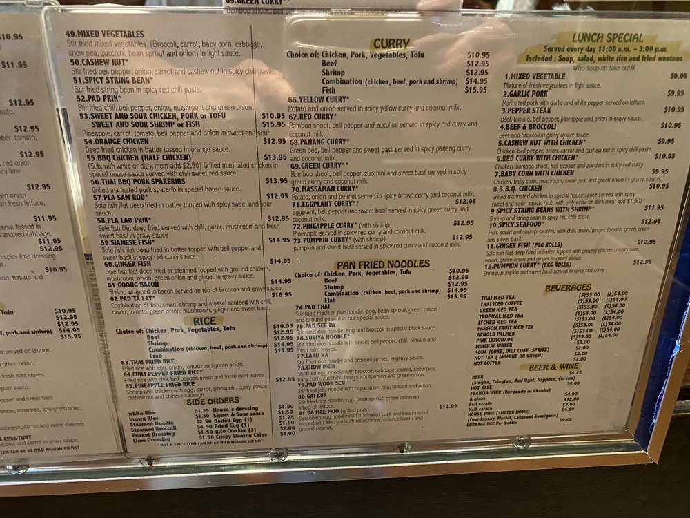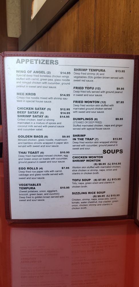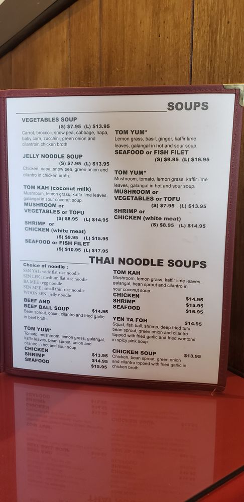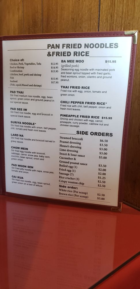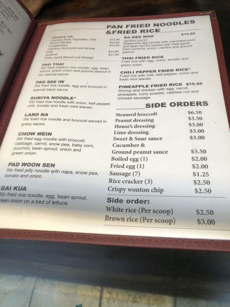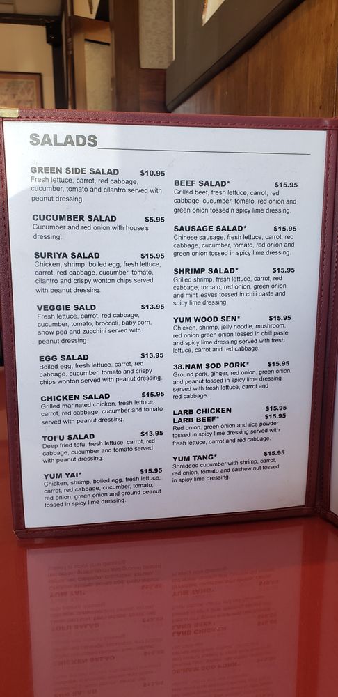 Suriya Thai offers a variety of traditional Thai dishes in a casual and quiet dining setting in Pasadena, CA. The menu includes street food options like Thai meatball skewers and grilled pork sausages, as well as appetizers like crispy noodle with shrimp and marinated protein skewers. Their soups, such as the Tom Yum Seafood Soup, are flavorful and satisfying. Customers have praised the quality and taste of the food, with many recommending dishes like the fried chicken appetizer and flavorful curries. The staff is friendly, and service is quick and efficient. Overall, Suriya Thai is a great spot for Thai food enthusiasts looking for tasty and authentic dishes in the Pasadena area.